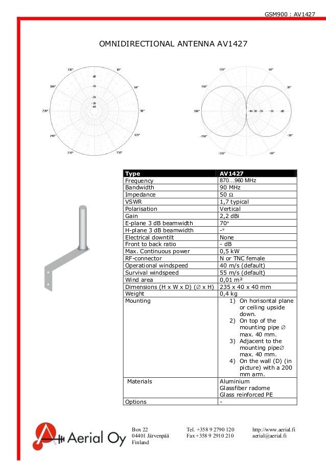 Download Data sheet: gsm900-basestation-antennas-gsm900-tukiasemaantennit-1-638 ArticleNo/ P/N: AV1427 Radiotype: Antenna 790-1000MHz, Antenna Base Station Aerial AV 1427 890-960 Mhz, Omni Specify N or TNC connector. Price request Download Data sheet: gsm900-basestation-antennas-gsm900-tukiasemaantennit-1-638
